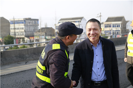 圖為集團副董事長、總經理張建平與督查組成員葉榮江握手 在施工現場,張建平對路面專項養護綜合督查組馮濟爐和葉榮江兩位同志說,你們就是公司的眼睛,要把握施工現場動態,把好施工質量和安全關;你們是公司的手,要督促工程保質保量快速推進。這是一次確立科學養護理念、鍛煉管養人才,展示公司硬實力的機會。看著這兩位老同志被陽光曬得黝黑的臉龐,張建平緊緊地握住他們的手,連聲對他們說:“你們辛苦了,你們辛苦了!”