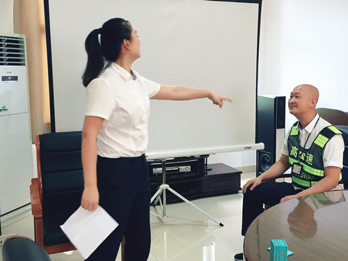 圖為員工扮演駕駛?cè)藛T 此次培訓一改枯燥乏味的傳統(tǒng)形式,工作人員結(jié)合平時窗口實際工作,分別擔任角色扮演,生動而又形象地演繹窗口服務(wù),真實地反映出收費員在收費過程中遇到的各類情景。比如:ETC車道無法正常通過、遇堵車分流、駕駛員情緒激動、綠農(nóng)車混裝未達到免費、入口如何勸離超限車輛等各類突發(fā)事件應(yīng)急處理辦法。