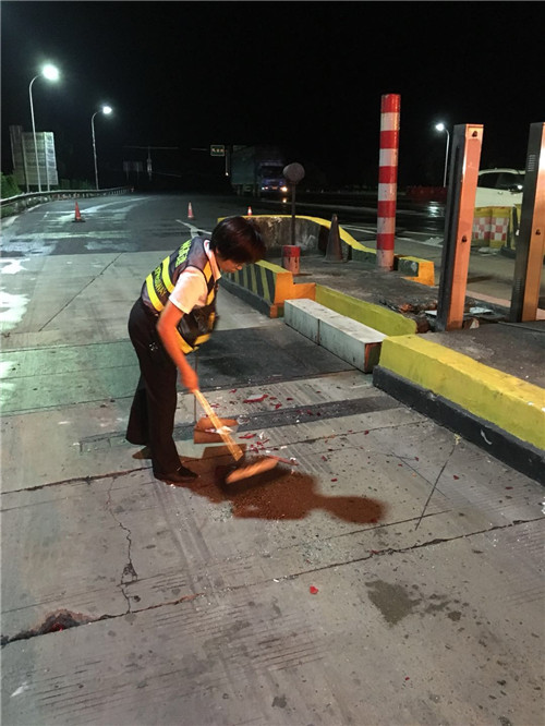 為了保暢通,收費班長讓司機拍照后開到外面等待處理,車輛駛離車道后,發(fā)現(xiàn)稱臺上罩殼跟防護欄被擠彎,地上剩下一堆玻璃碎片殘渣。班長正在處理相關事宜時,發(fā)現(xiàn)收費員張小芬已經麻利的在車道上清理殘余碎片,不多久就恢復了超寬車道通行。