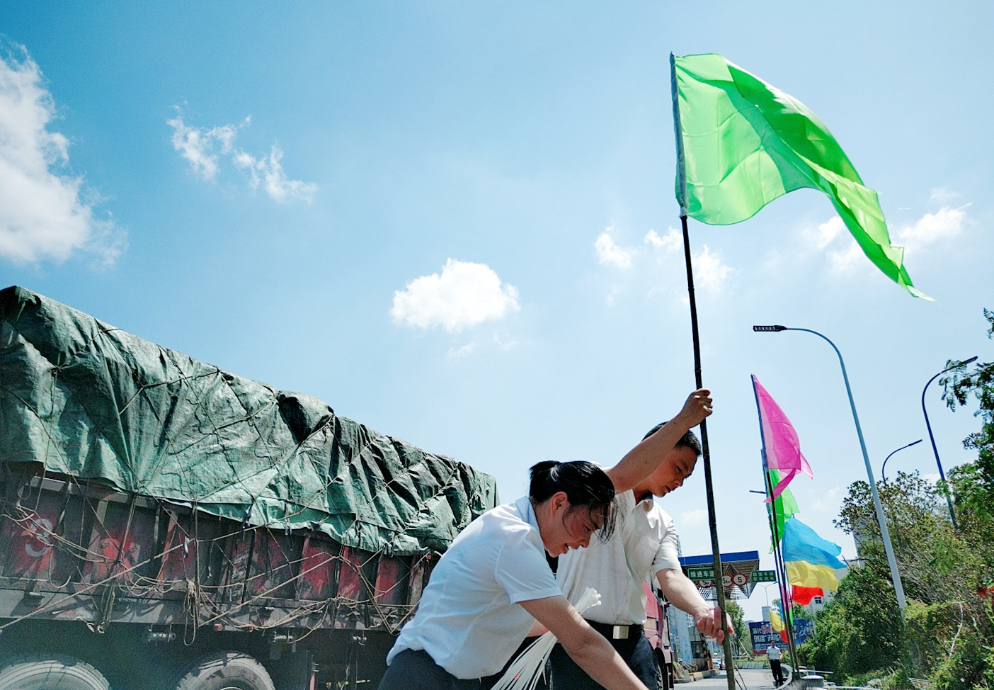 圖為工作人員插彩旗