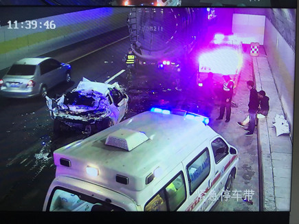 圖為事故現(xiàn)場 情況緊急,一接到指令,巡邏車立即在南廣場調(diào)頭,趕赴事故現(xiàn)場。而此時較大的車流量已造成后方堵車,導(dǎo)致巡邏車被堵在隧道口,執(zhí)勤隊員怕時間耽擱太久,便火速跑到事故現(xiàn)場,第一時間將車里的人員救出。所幸轎車內(nèi)四人只有一人腳上受傷,中控立即拔打120急救電話。在他們還在施救的時候,追尾事故卻頻頻發(fā)生,500米左右、1300米左右的超車道上先后發(fā)生兩小車、三車追尾事故,隧道內(nèi)排起了長龍。為了保證在最短時間內(nèi)恢復(fù)正常通行,執(zhí)勤隊員忙著奔赴現(xiàn)場指揮預(yù)警,應(yīng)急救援有序展開。 現(xiàn)場,監(jiān)控中心、交警、執(zhí)勤隊等部門分工協(xié)作,整個施救過程一直持續(xù)到中午12點多才順利完成。盡管執(zhí)勤隊員到現(xiàn)在都滴水未進,但每個人臉上繃緊的神經(jīng)終于都得到了放松。 林玲