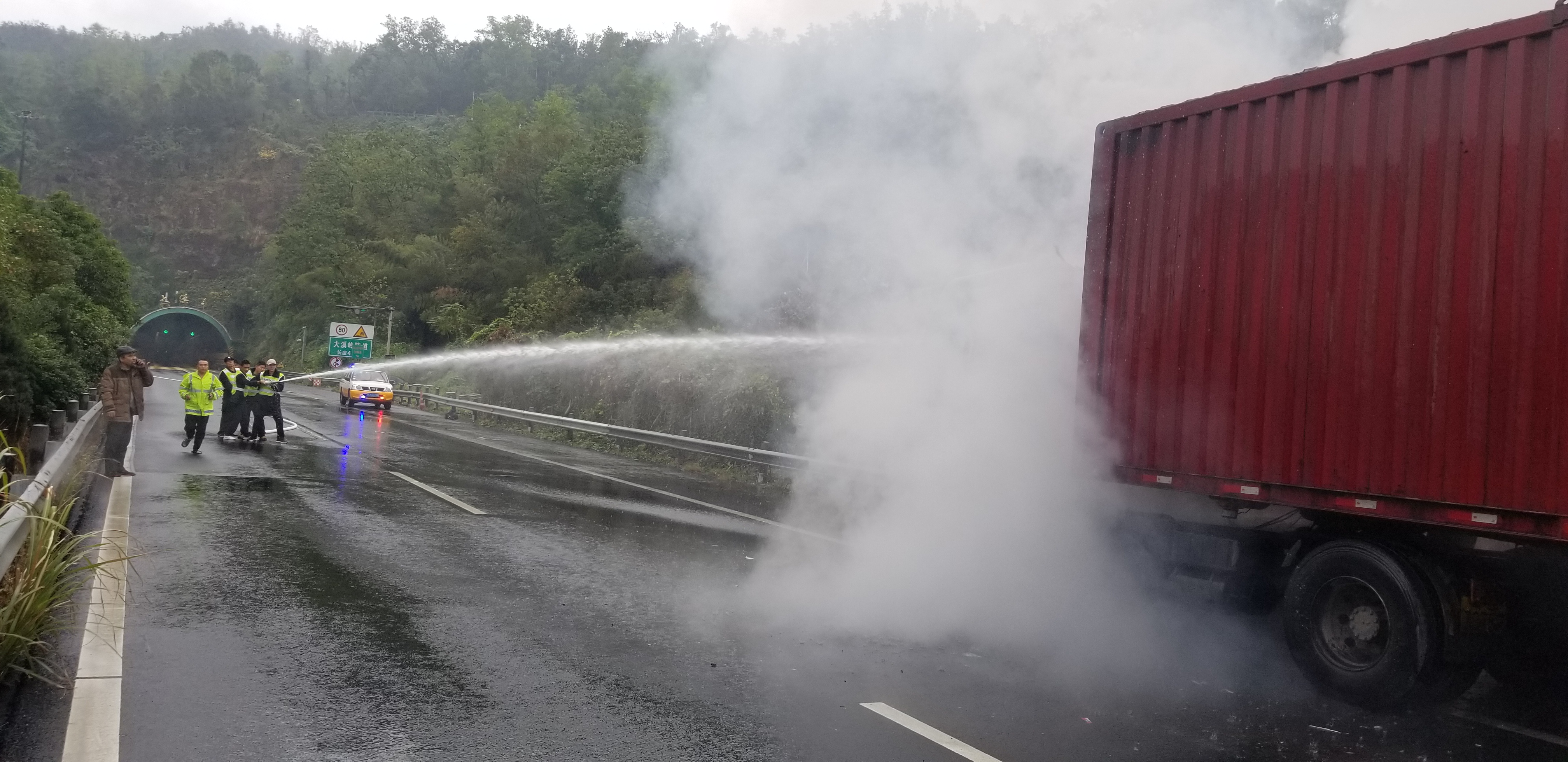 圖為滅火現場 09:16分,巡邏車到達現場。貨車車頭火勢較大,而離著火車輛最近的消防栓在北廣場,距離火點有140米,巡邏車上備用的兩卷水帶根本不夠用。在所長的指示下,隊長立刻做出安排,一人攜帶小紅帽前去事故車后方設卡,另一人攜帶兩卷水帶前去北廣場消防栓做水帶連接。隊長隨后開巡邏車前往大溪嶺溫向隧道就近取水帶,隊員們在2分鐘內迅速將5卷水帶連接好,13分鐘后,火勢終于得到控制。 由于火勢控制及時,火勢并沒有蔓延到集裝箱內,減少了駕駛員的損失。10:34分,現場事故處置完畢,溫向隧道恢復正常通行。 孫鵬