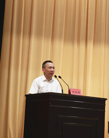 圖為集團黨委副書記、副董事長、總經理張建平在主席臺上作交流發言