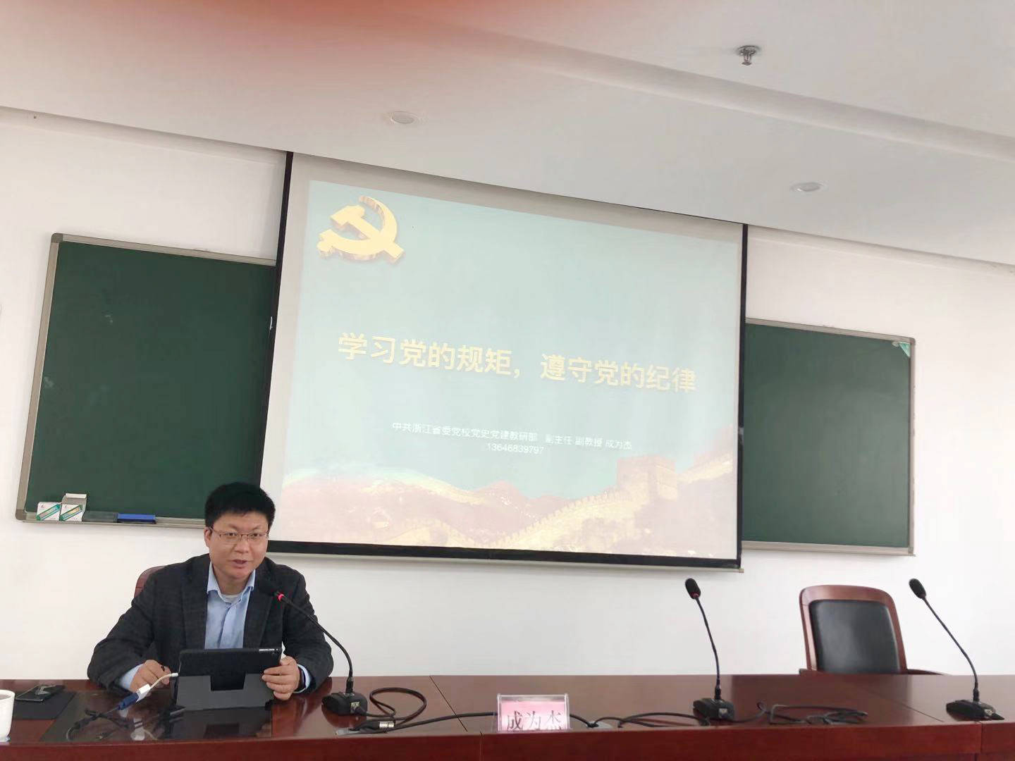 圖為省委黨校黨史黨建教研部副主任、副教授、博士成為杰以《學習黨的規矩 遵守黨的紀律—黨章黨規黨紀解讀》為題授課
