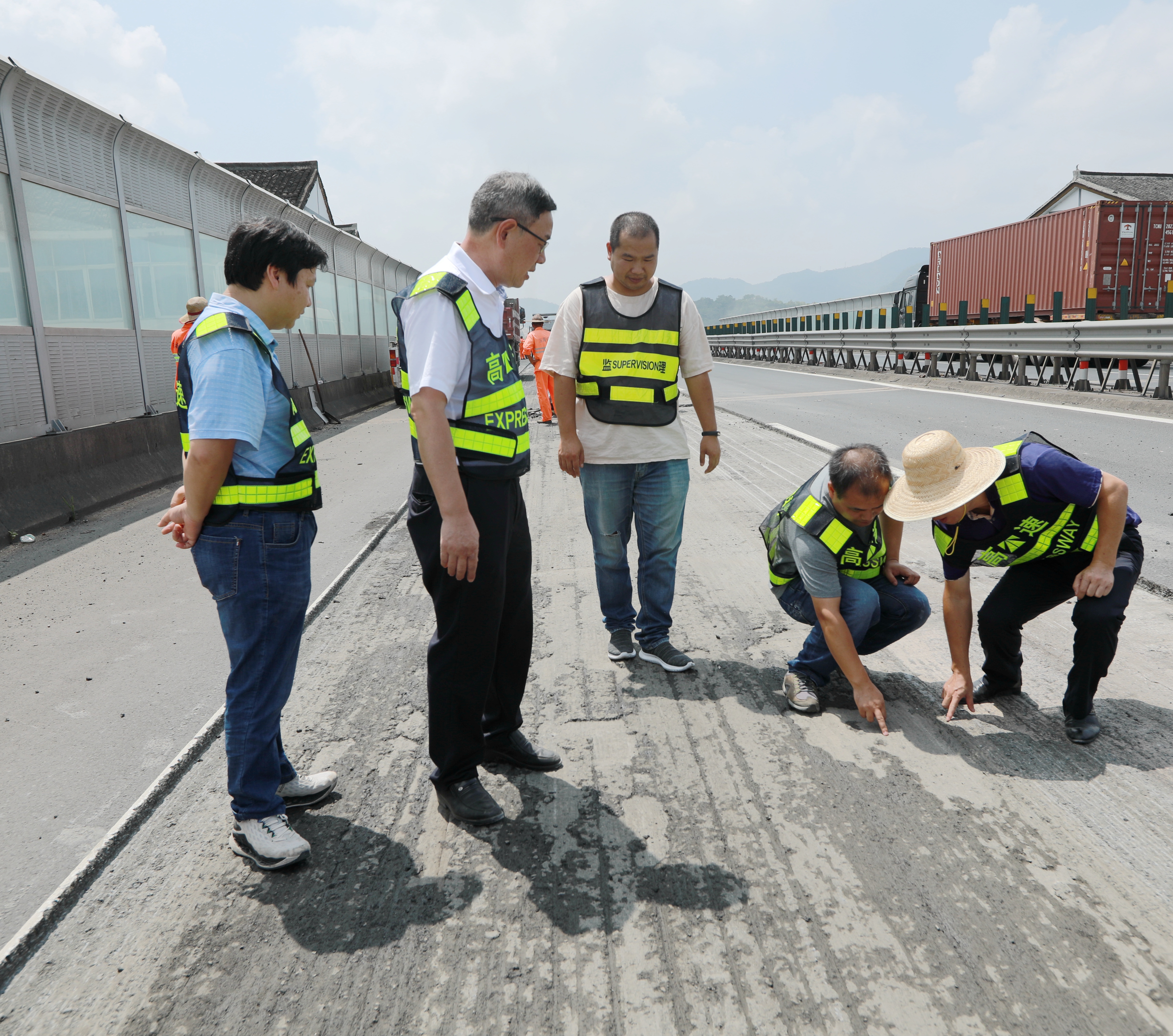 上午,臺州高速集團黨委書記、董事長、總經理陳文波,公司黨委委員、總工程師江輝,以及工程部相關人員一起來到公司所轄路段,檢查施工進展情況。
