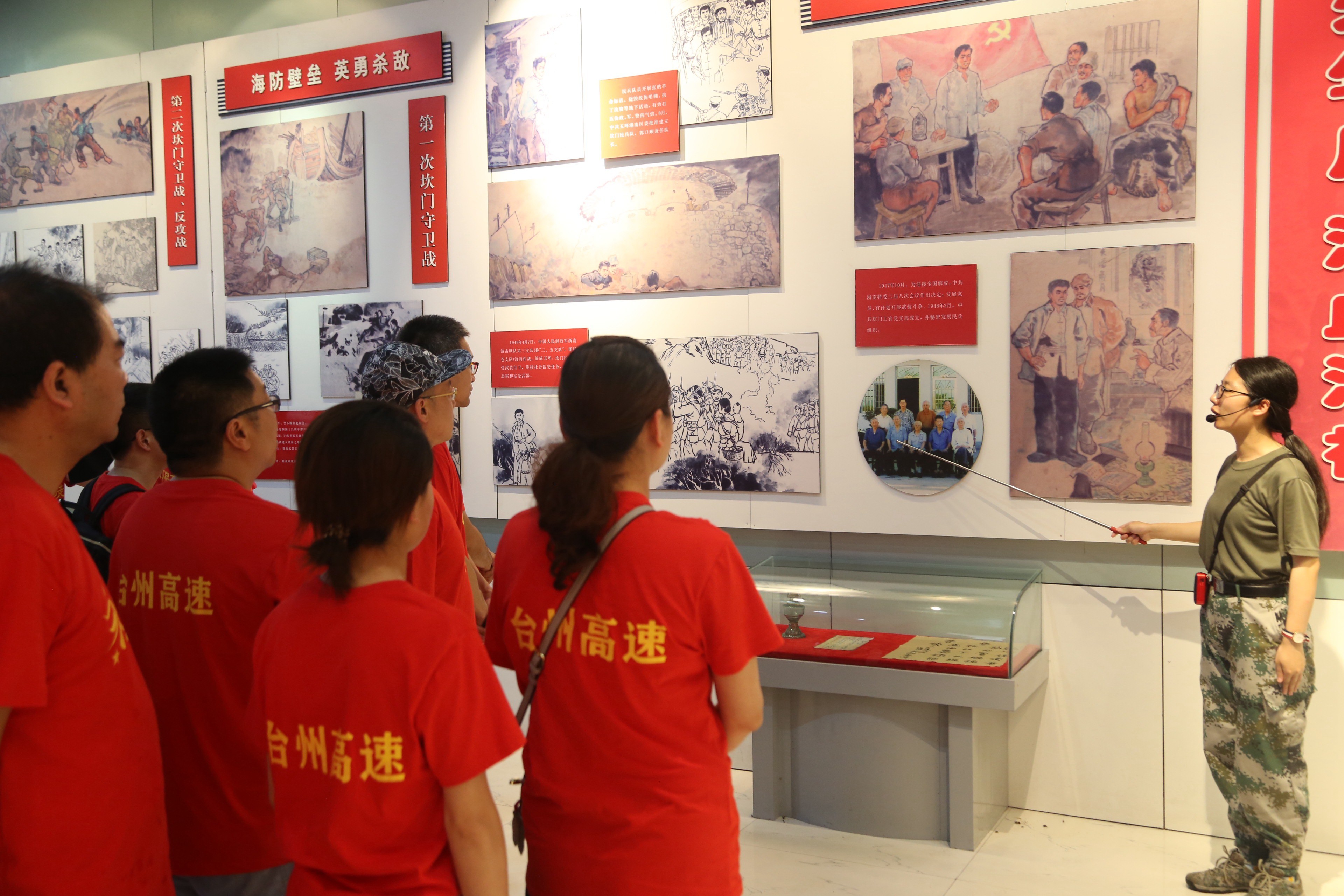活動(dòng)當(dāng)天,烈日炎炎抵擋不住大家追溯紅色基地的熱情,黨員隊(duì)伍緊跟黨旗,順著“紅色地圖”,沿著崎嶇小道,大步爬上玉環(huán)坎門英雄基干民兵營(yíng)。在女民兵們的熱心引導(dǎo)和生動(dòng)解說下,大家側(cè)耳傾聽,目不轉(zhuǎn)睛地觀看展示墻上與玻璃柜中的民兵隊(duì)歷史事跡照片、繳獲的槍支、文件與榮譽(yù)獎(jiǎng)?wù)碌鹊龋癍h(huán)坎門人民的紅色抗?fàn)帤v史仿佛仍歷歷在目,打動(dòng)著每位黨員的內(nèi)心。隨后,大家在黨旗前光榮宣誓,重溫入黨誓詞,各位黨員緊握右拳,用洪亮的聲音表達(dá)著自己對(duì)黨的忠誠(chéng),對(duì)初心使命的矢志不渝。