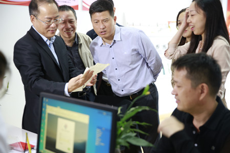 圖為市委常委、常務(wù)副市長董貴波在現(xiàn)場與公司總經(jīng)理張建平交流