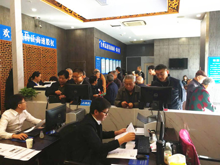 10月31日當(dāng)天,全市各收購(gòu)點(diǎn)股東絡(luò)繹不絕,股東轉(zhuǎn)讓熱情高漲,場(chǎng)面尤其火爆。當(dāng)天下午,收購(gòu)時(shí)間點(diǎn)過(guò)后,還有股東在收購(gòu)點(diǎn)辦理轉(zhuǎn)讓手續(xù)。