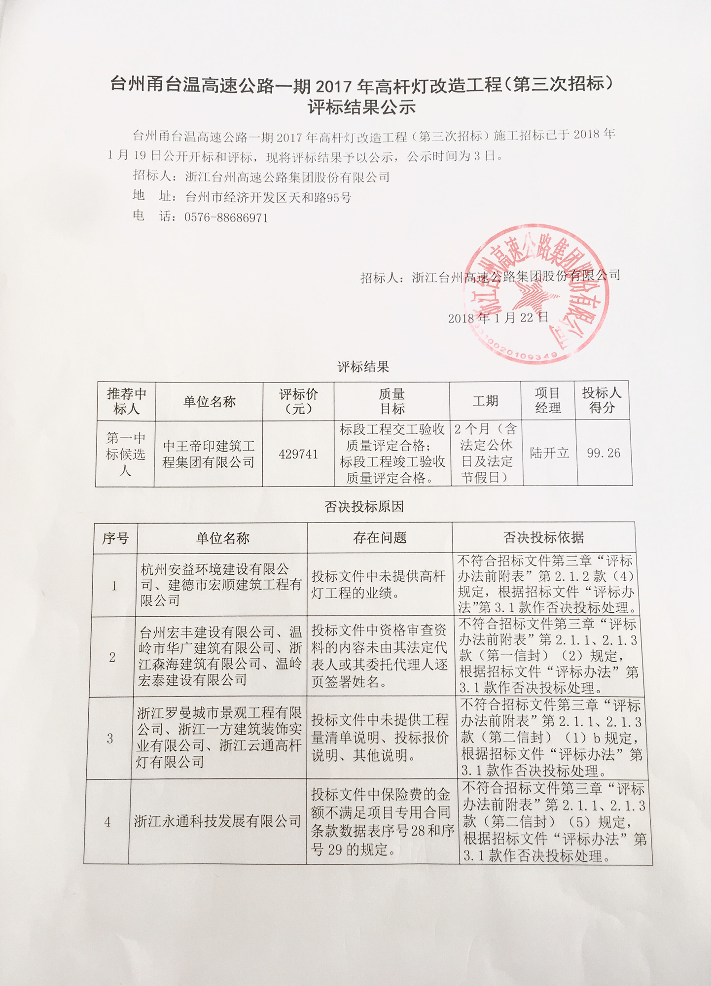 臺州甬臺溫高速公路一期2017年高桿燈改造工程(第三次招標)評標結果公示
