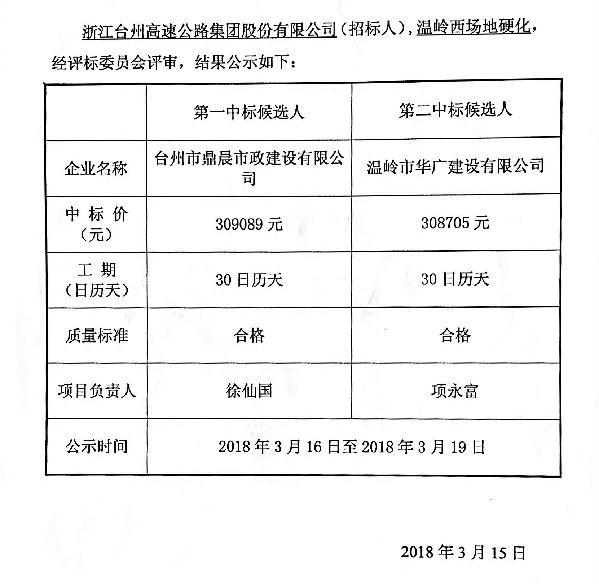 溫嶺西場地硬化工程中標候選人公示單