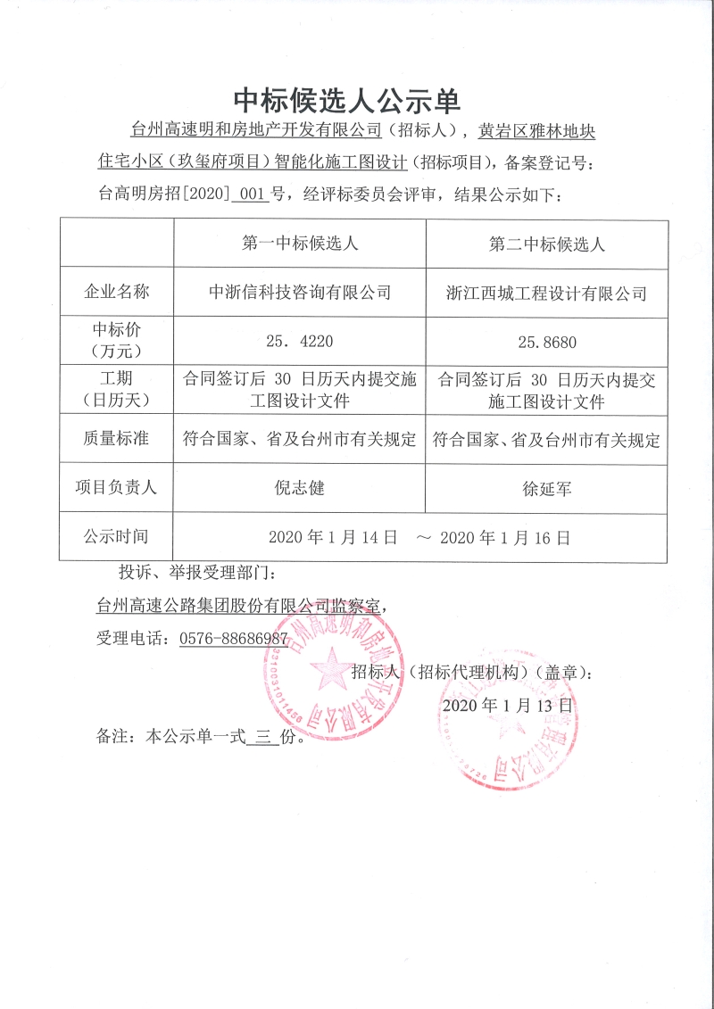 黃巖區(qū)雅林地塊住宅小區(qū)(玖璽府項目)智能化施工圖設(shè)計中標(biāo)候選人公示單