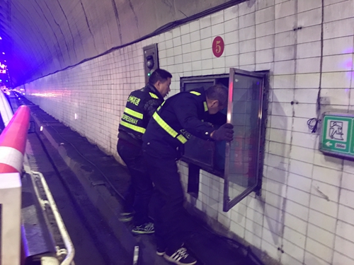 圖為工作人員檢查消防設備 冬日的隧道內寒風刺骨,執勤隊員在轟鳴不止的噪音以及嗆人的汽車尾氣中,有條不紊地開始隧道清洗及設備檢修工作。一組人員站在登高車站臺上,檢修故障攝像機及燈具,擦拭隧道內每個攝像機鏡頭、LED燈具。一組人員手持電筒,打開每一個消防設備箱,逐一檢查水帶、消防水龍頭、管道閥門等設施設備,仔細地排查各類安全隱患。 “再等2號故障攝像頭檢修清洗結束后回來。”已過下午1點鐘,黃土嶺隧道所副所長盧祖理還沒吃午飯,仍然埋頭于工作。